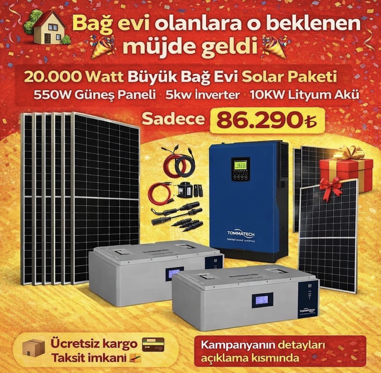 • • 2 Adet TommaTech 51.2V 100Ah LiFePO4 Lityum Batarya (≈10,2 kWh depolama)