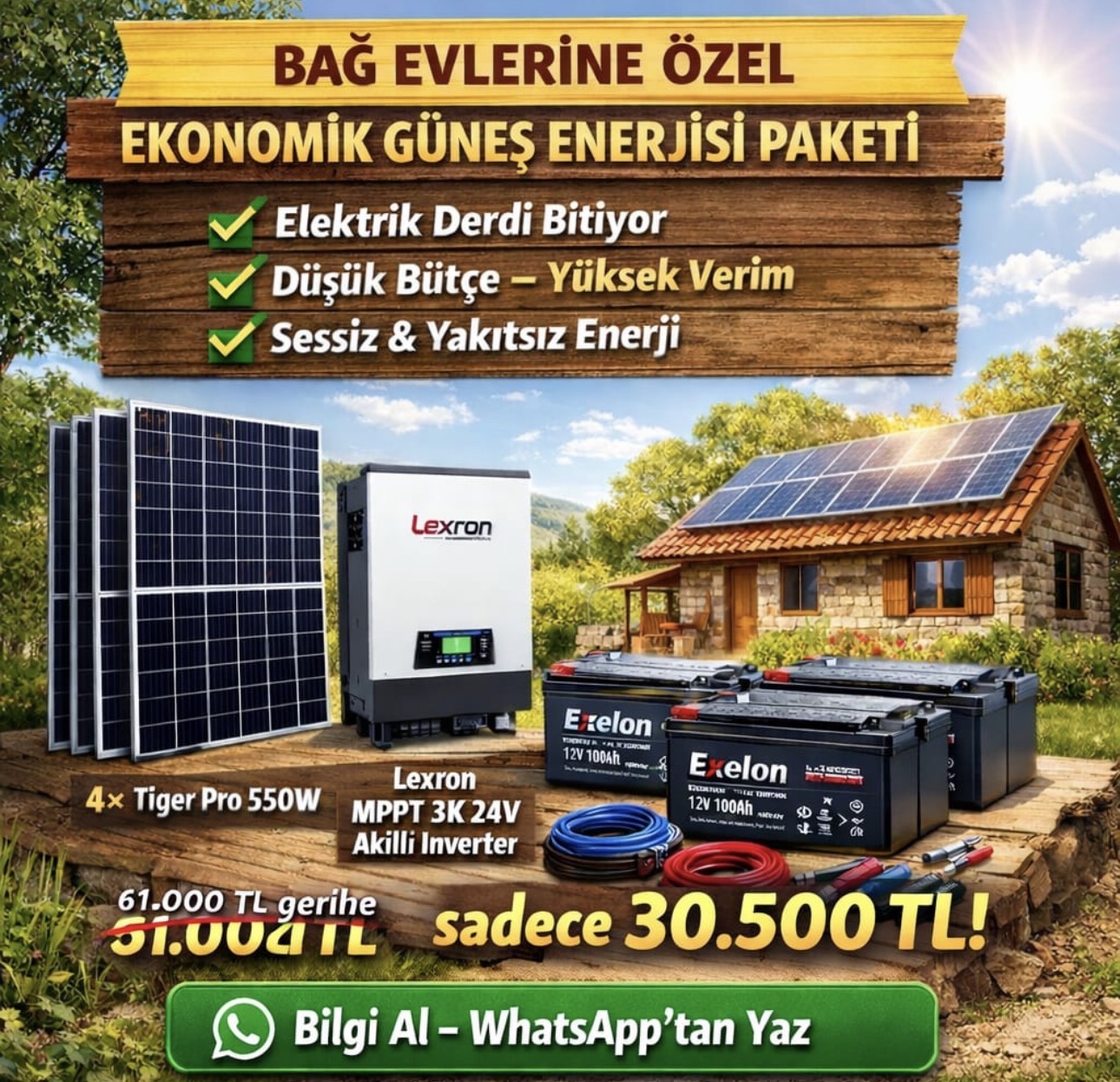 • ? Bağ evi, yayla evi, bahçe evi için günlük temel elektrik ihtiyacını rahatlıkla karşılar.